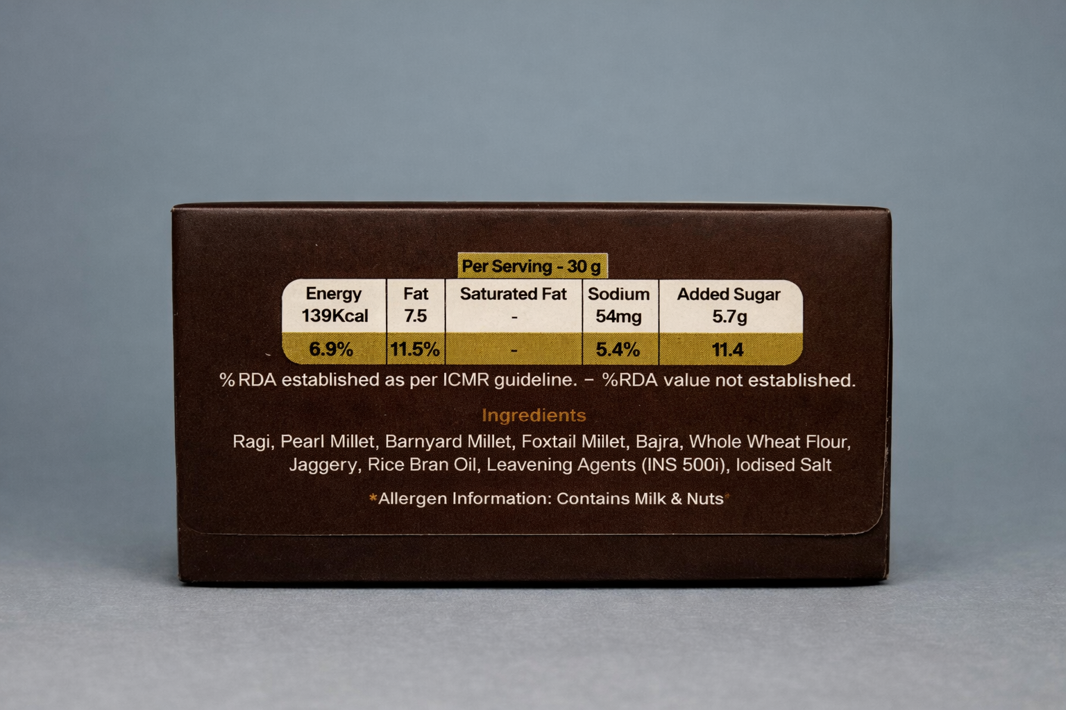 Ragi, Pear Millet, Foxtail Millet, Bajra, Whole Wheat Flour, Jaggery, Rice Bran Oil, Leaving Agents (NS500ii), Lodised salt