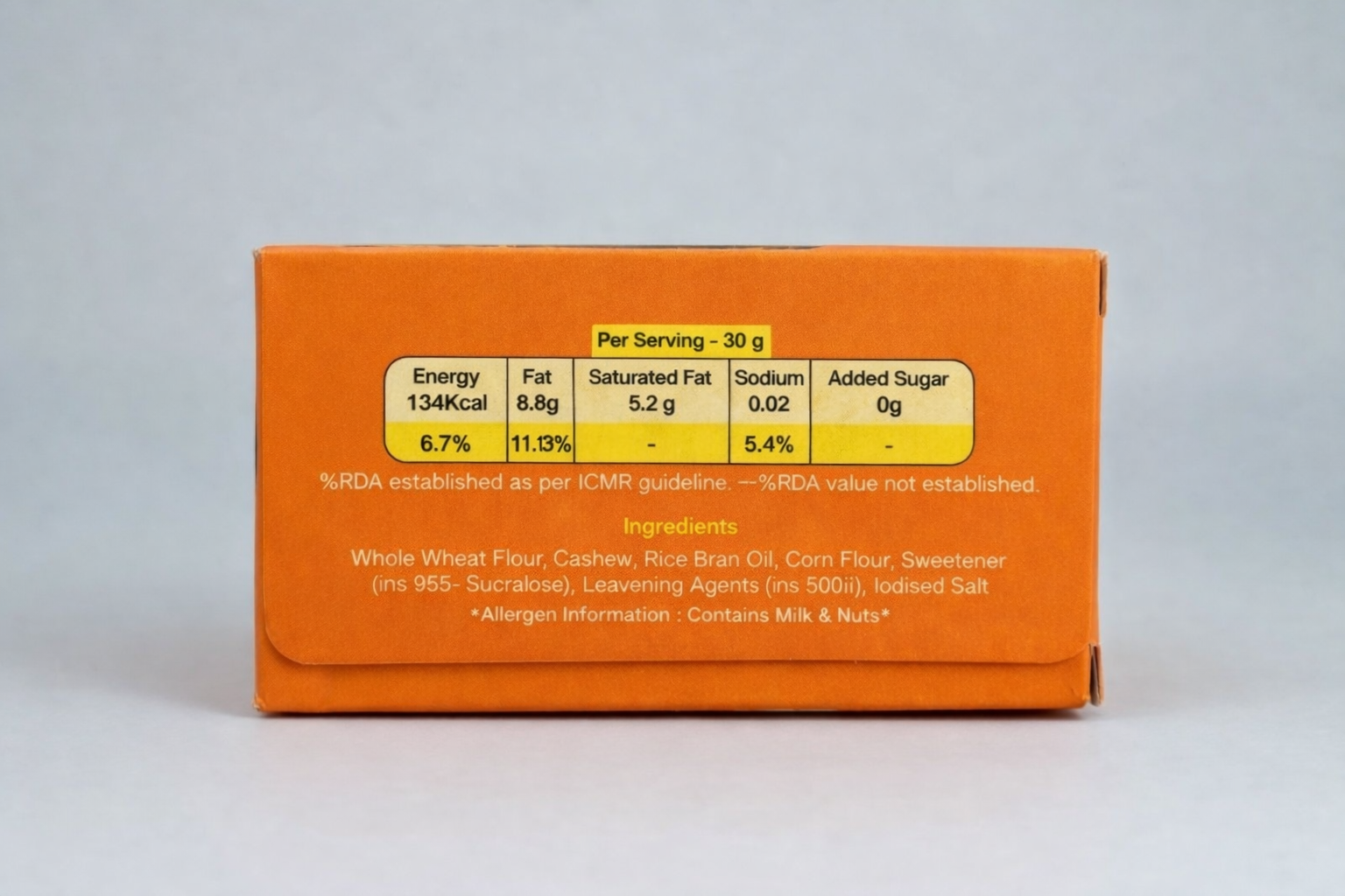 Whole Wheat Flour, Cashew, Rice Bran Oil, Corn Flour, Sweetner (INS 955- Sucralose), Leavening Agents (INS 500ii), Iodised Salt